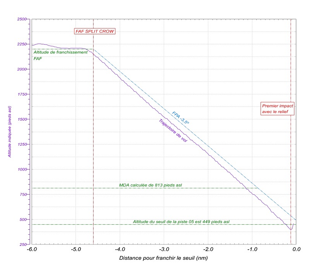À 0 h 29 min 27 s, le radioaltimètre a généré le message audio automatisé (message automatisé) « 400 » pour indiquer que l'aéronef se trouvait à 400 pieds au-dessus du relief. Presque immédiatement après cette annonce, l'aéronef a franchi la MDA calculée à 1,2 nm du seuil de piste. Le PS a aperçu des feux d'approche et a annoncé « Minimum, feux seulement » alors que l'aéronef était à environ 1,0 nm du seuil de piste. Le PC a immédiatement annoncé « Atterrissage », et a commencé à apercevoir quelques feux d'approche. À ce moment, l'aéronef avait franchi la MDA publiée (740 pieds ASL), mais se trouvait à 0,3 nm derrière la distance publiée. Le pilote automatique est demeuré embrayé alors que l'aéronef poursuivait sa descente; il n'y a eu aucune réduction du taux de descente.