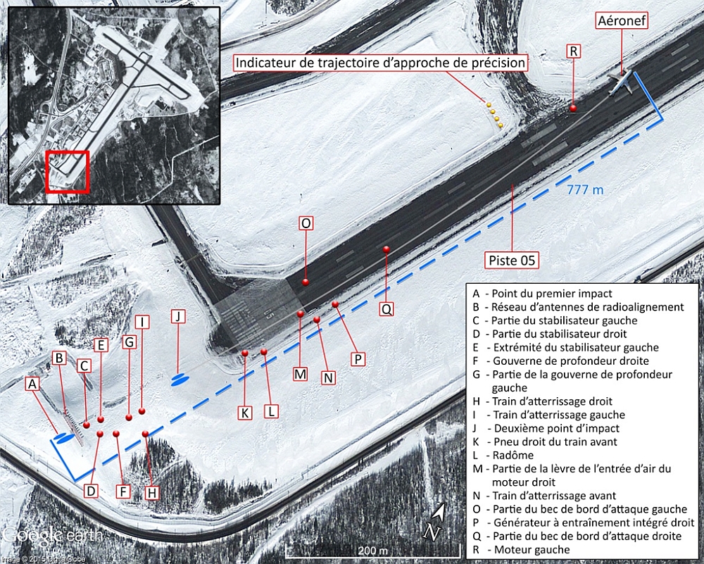 Environ 1 seconde avant le premier impact avec le relief, le PC a avancé les manettes de poussée à la butée de décollage-remise des gaz avec sollicitation maximale de cabré du manche latéral. Un des pneus du train d'atterrissage principal gauche a heurté un feu d'approche situé à 861 pieds du seuil de piste. À 0 h 30 min, le train principal de l'aéronef, le dessous de la partie arrière du fuselage et le capot du moteur gauche ont percuté le sol enneigé sur le côté sud du talus dont l'inclinaison montait vers la surface de la piste. L'aéronef a alors percuté le réseau d'antennes de radioalignement et a poursuivi sa course avant de percuter le sol à 2 autres reprises et de glisser sur la piste. L'aéronef s'est immobilisé à quelque 1900 pieds au-delà du seuil de piste. Pendant ces mouvements, il y a eu perte totale d'alimentation électrique dans l'aéronef. Les lumières à l'intérieur de la cabine se sont éteintes, et l'éclairage d'urgence s'est allumé automatiquement.