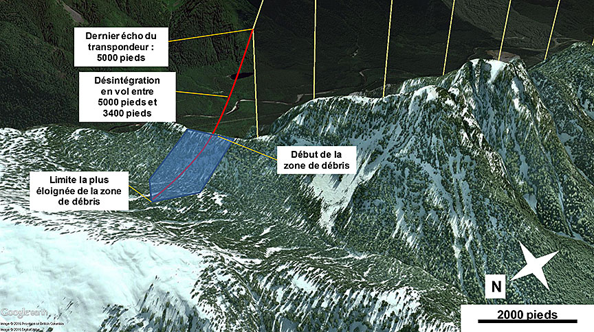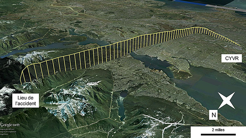 Peu après le décollage, le CA66 a communiqué avec le contrôleur des départs à CYVR et a reçu l'autorisation de monter à 9000 pieds au-dessus du niveau de la mer (ASL) Note de bas de page 3. Peu après, le contrôleur de la circulation aérienne a assigné au vol un cap vers le nord. À 7 h 7, le contrôleur des départs à CYVR a indiqué au CA66 qu'il devait changer de fréquence radio et communiquer avec le centre de contrôle aérien à CYVR. À sa première communication avec le centre de contrôle aérien à CYVR, alors qu'il franchissait 7500 pieds en montée, le CA66 a de nouveau reçu l'autorisation de monter à l'altitude de vol prévue, soit le niveau de vol FL200 Note de bas de page 4. À 7 h 8, l'équipage de conduite a accusé réception de l'autorisation de monter au FL200; il s'agit de la dernière transmission radio du CA66. Une minute et 20 secondes plus tard, alors qu'il franchissait 8700 pieds en montée en suivant le cap assigné de 350° magnétique, l'aéronef a disparu des écrans de radar secondaire de surveillance du contrôle de la circulation aérienne Note de bas de page 5.