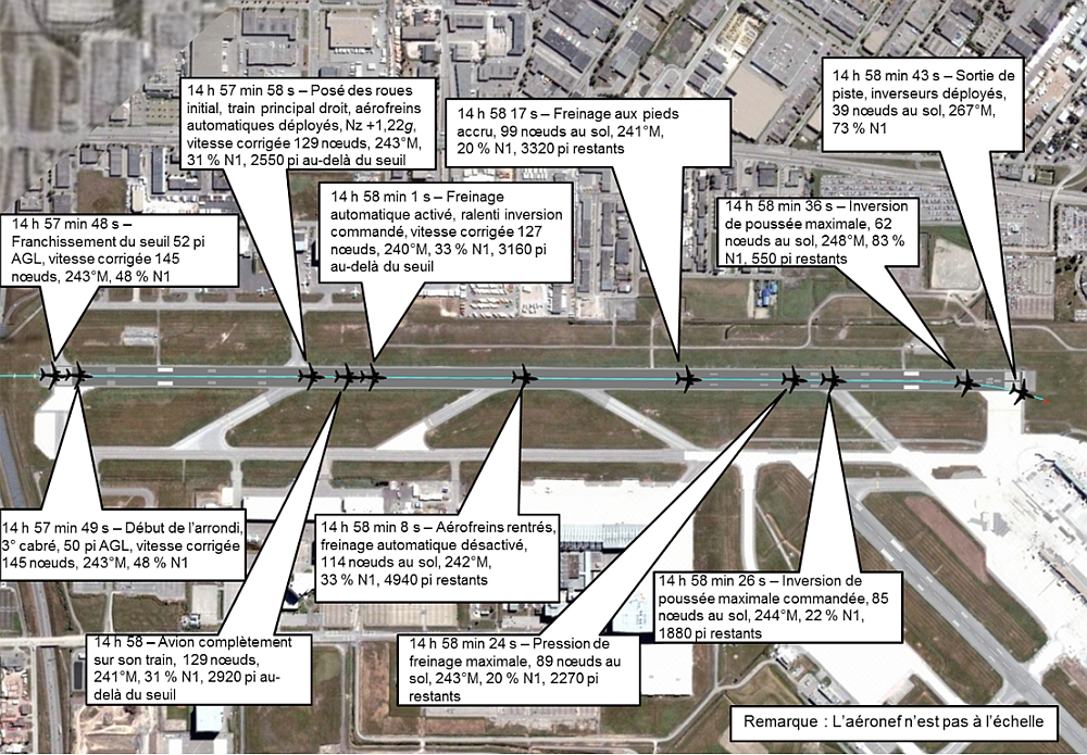 Le pilote automatique a été débrayé pendant que l'aéronef descendait à environ 280 pieds AGL. L'aéronef a commencé à dévier au-dessus de l'alignement de descente et a franchi le seuil de la piste à 52 pieds AGL à une vitesse de 145 nœudsNote de bas de page 3 (Vref + 20) à 14 h 57 min 48 s (annexe A). L'aéronef a atterri sur le train d'atterrissage principal droit 10 secondes plus tard, à environ 2550 pieds au-delà du seuil de la piste, à une vitesse de 133 nœuds. Les aérofreins se sont déployés automatiquement. L'aéronef a rebondi brièvement après le dernier poser des roues, et à 14 h 58 min 1 s, le freinage automatique s'est activé et les 2 manettes d'inversion de poussée ont été mises au cran de ralenti.