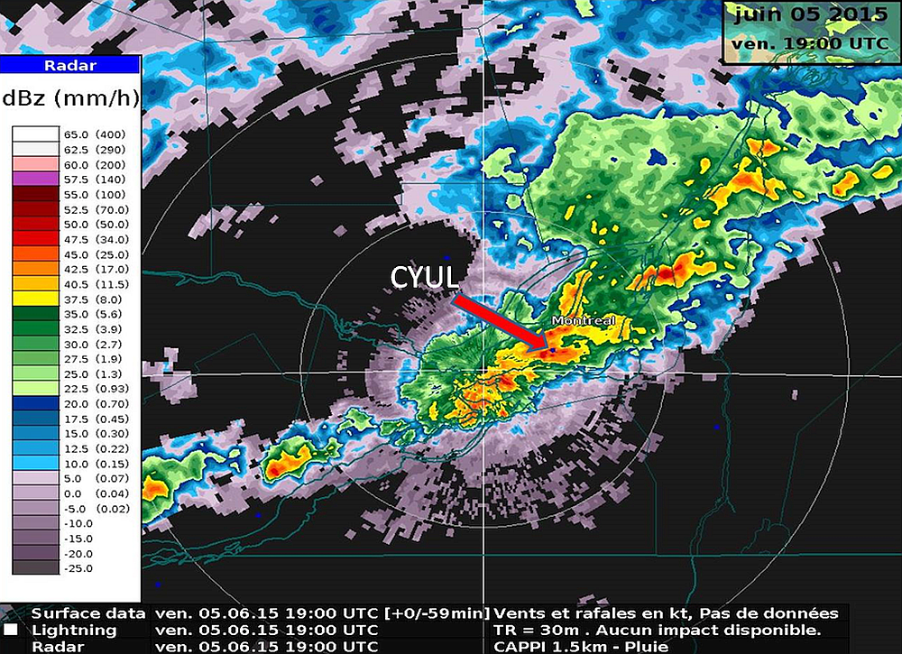 Pendant qu'il effectuait l'approche par guidage radar, l'équipage a observé sur le radar météorologique de l'aéronef qu'il y avait des averses de pluie de modérées à fortes au nord‑nord‑ouest du terrain. Une fois établi au cap 330 °M, en base gauche pour la piste 24L, l'équipage a observé sur le radar météorologique de fortes précipitations de pluie sur la trajectoire d'approche, mais aucune turbulence ou grêle. À 14 h 53, à environ 8,8 milles marins (nm) de la piste, l'aéronef a été configuré pour l'atterrissage : volets braqués à 30 °, train d'atterrissage sorti et aérofreins armés.