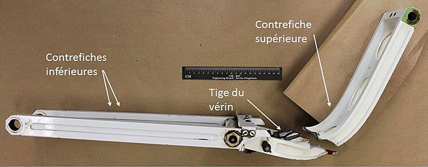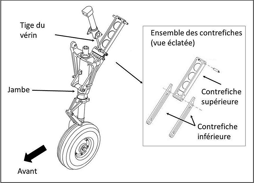 L'ensemble de contrefiches du train d'atterrissage avant se compose d'une contrefiche supérieure et de 2 contrefiches inférieures et est installé entre la jambe et les composants structuraux du puits de roues (figure 1). Le vérin est installé entre la contrefiche supérieure et les composants structuraux du puits de roues. Lorsque le vérin passe à la position rentrée, l'ensemble de contrefiches se plie vers le haut, ce qui fait pivoter la jambe vers l'arrière dans le puits de roues.