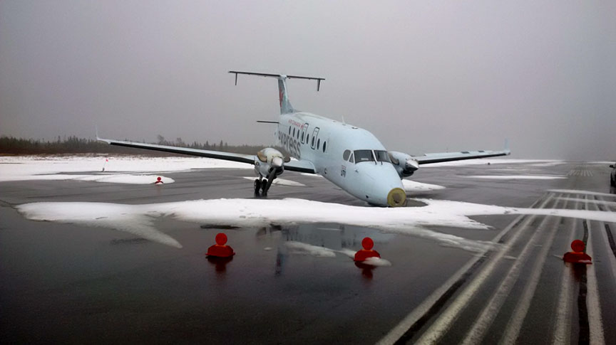 En raison de la poudrerie, l'équipage avait de la difficulté à repérer les marques de l'axe de piste, et cette poudrerie réduisait les repères visuels s'offrant au commandant de bord. La situation était exacerbée par l'absence de feux d'axe de piste et par une possible illusion visuelle causée par la poudrerie. Ni l'un ni l'autre des pilotes n'avait envisagé que la combinaison de vents traversiers, de poudrerie et d'un atterrissage de nuit avec visibilité réduite sur une piste dépourvue de feux d'axe de piste constituait un danger qui pouvait poser des risques supplémentaires.