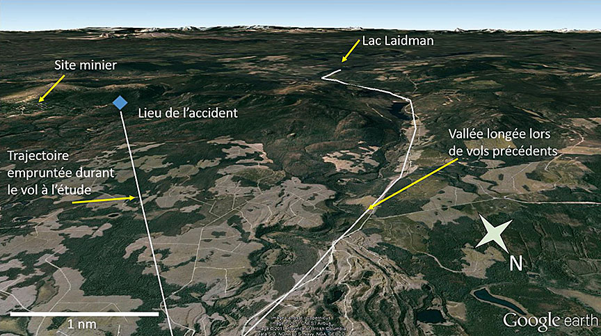 Lors de vols précédents vers son site de villégiature, le pilote avait généralement suivi une route directe durant la majorité de la route, avant de suivre une vallée fluviale qui débouche au lac Laidman (figure 1). Le long de cette vallée, l'élévation du relief est relativement constante, de 3100 à 3200 pieds au-dessus du niveau de la mer (ASL). Ainsi, pendant près de 20 minutes après le départ, l'aéronef a volé en direction sud-ouest à une altitude de 300 à 500 pieds AGL. Alors que l'aéronef se trouvait à quelque 12 milles marins (nm) du lac Laidman, le pilote a dévié de sa route habituelle. Il a changé de cap pour survoler un site d'exploration minière situé sur un relief plus élevé à l'est du lac. Dans ce secteur, le relief atteint une élévation de 3200 à 4600 pieds ASL sur une distance d'environ 4,5 nm. Pendant environ 4 minutes, l'aéronef a poursuivi son vol à une altitude constante au-dessus d'un relief ascendant, jusqu'à ce qu'il survole un flanc de montagne à environ 100 pieds au-dessus des arbres.