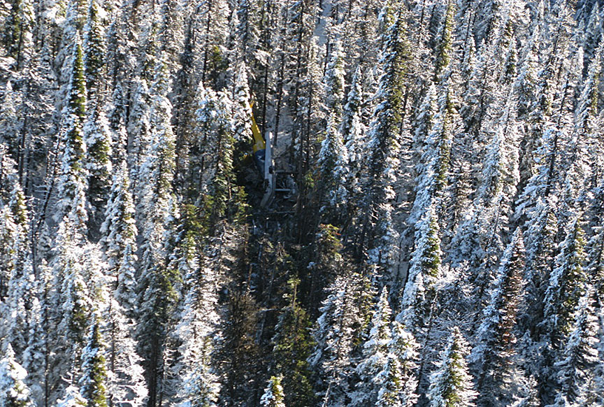On a retrouvé l'épave dans une zone enneigée et uniformément boisée à environ 1,5 nm au nord-ouest du site minier et 11 nm à l'est du lac Laidman. L'aéronef a été lourdement endommagé lorsqu'il a percuté les arbres et le relief (figure 2). Aucun incendie ne s'est déclaré après l'impact.