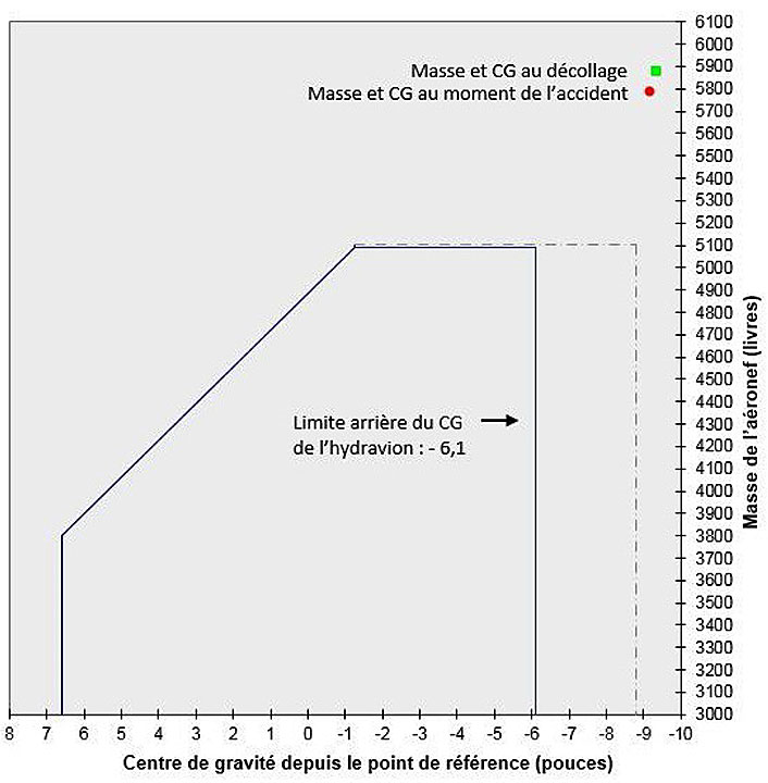L'enquête a établi que l'aéronef transportait 495 livres de marchandises et 209 livres de carburant, et que le poids combiné des occupants était de 1032 livres. La masse totale de l'aéronef s'élevait donc à 5772 livres, pour un centre de gravité (CG) situé à 9,2 pouces derrière la référence de centrage (figure 4). Ainsi, la masse de l'aéronef excédait la masse maximale autorisée au décollage de 682 livres, et le CG dépassait de 3,1 pouces la limite arrière.