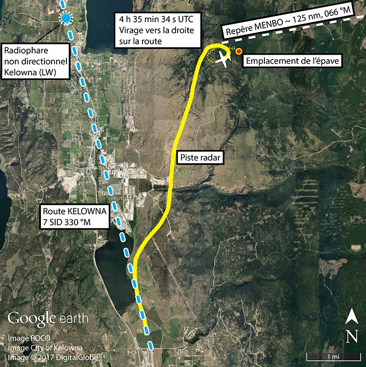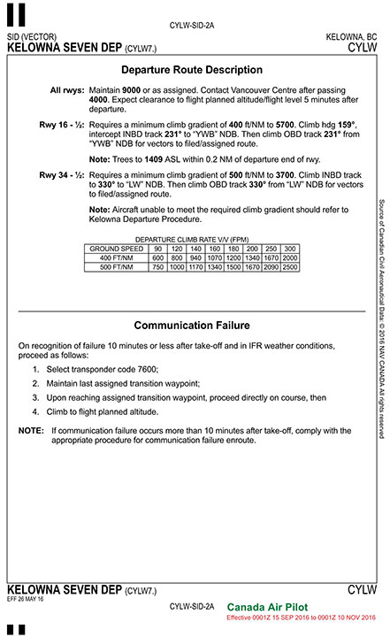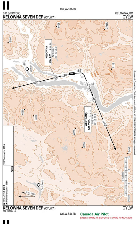 Les instructions SID KELOWNA SEVEN DEP pour la piste 34 indiquaient de monter à 9000 pieds asl, ou à l'altitude assignée par le contrôle de la circulation aérienne (ATC), et de communiquer avec le centre de contrôle régional (ACC) de Vancouver après avoir franchi 4000 pieds asl en montée. L'aéronef devait ensuite monter et suivre le relèvement 330° magnétique (M) en rapprochement jusqu'au radiophare non directionnel Kelowna (LW). À partir de LW, l'aéronef devait monter et suivre le relèvement 330 °M en éloignement pour obtenir les vecteurs vers la route prévue et assignée.