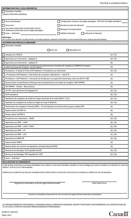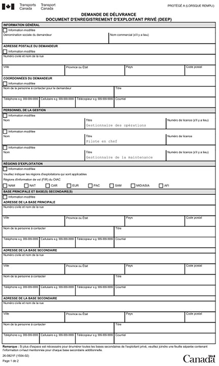 Annexe B – Formulaire de demande – Document d’enregistrement d’exploitant privé