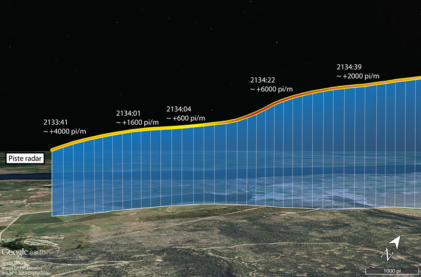Figure 3. Vue de la vitesse ascensionnelle du C-GTNG, de 21 h 33 min 41 s à 21 h 34 min 39 s (source : Google Earth, avec annotations du BST)