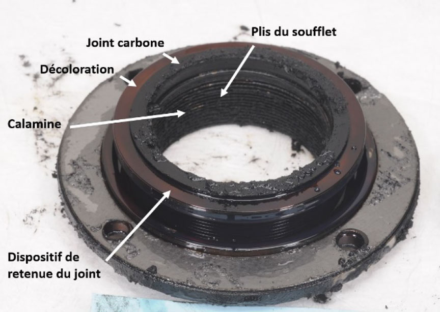 - Les dépôts de carbone qui s'étaient accumulés dans les plis du soufflet ont réduit la capacité du soufflet de prendre de l'expansion et de fournir une étanchéité parfaite avec le joint rotatif.