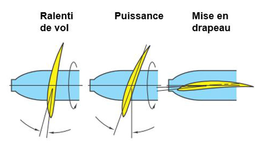 À mesure qu'augmente l'angle de calage des pales des hélices, les pales brassent de plus en plus l'air, ce qui réduit le régime moteur jusqu'à la position de mise en drapeau. À la position de mise en drapeau, les pales sont parallèles à l'écoulement d'air et produisent des forces dynamiques très faibles. À l'inverse, lorsque l'angle de calage diminue, les pales brassent de moins en moins l'air, ce qui fait croître le régime moteur.