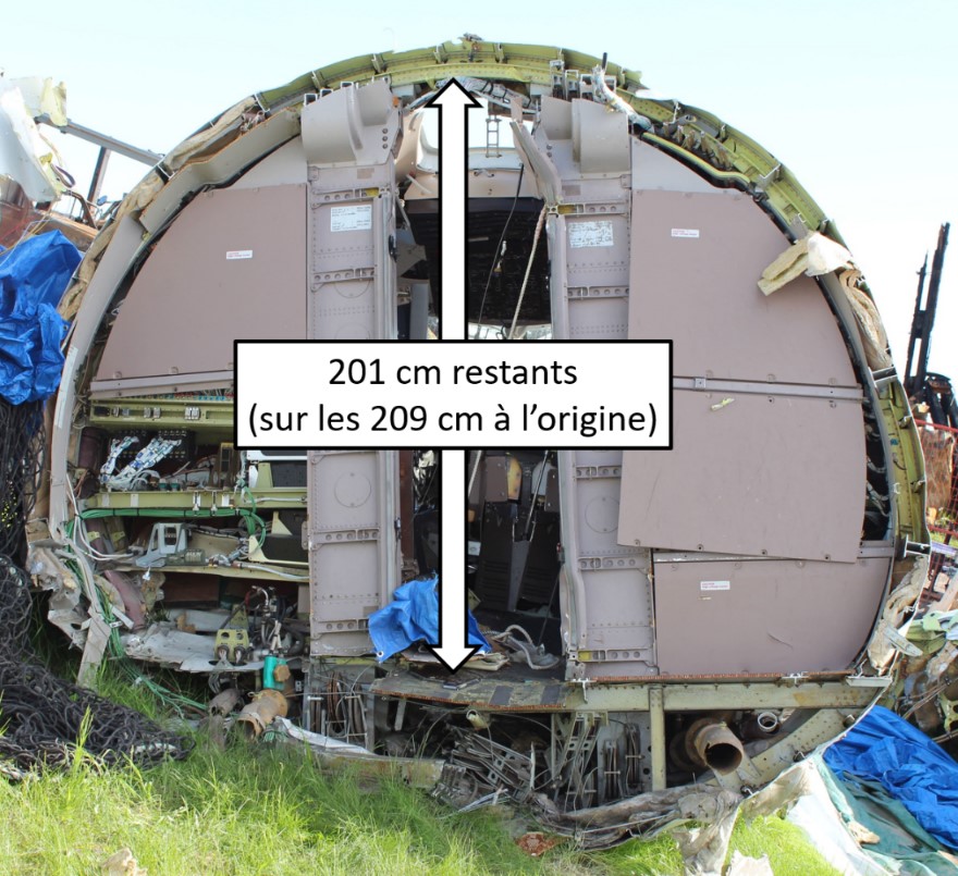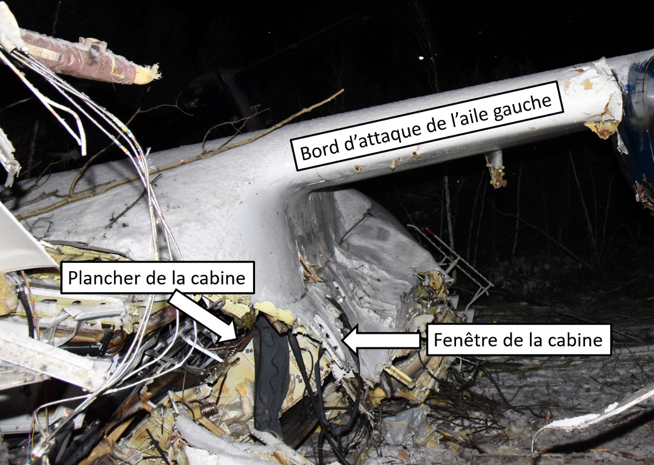 L’aéronef a percuté le sol dans une assiette en tangage relativement neutre, avec un angle d’inclinaison de 30° à gauche. En conséquence de la décélération verticale soudaine au contact du sol, l’aéronef a subi des dommages importants dont la gravité variait selon les emplacements sur l’aéronef, étant donné l’angle d’impact et une conception structurale variable.