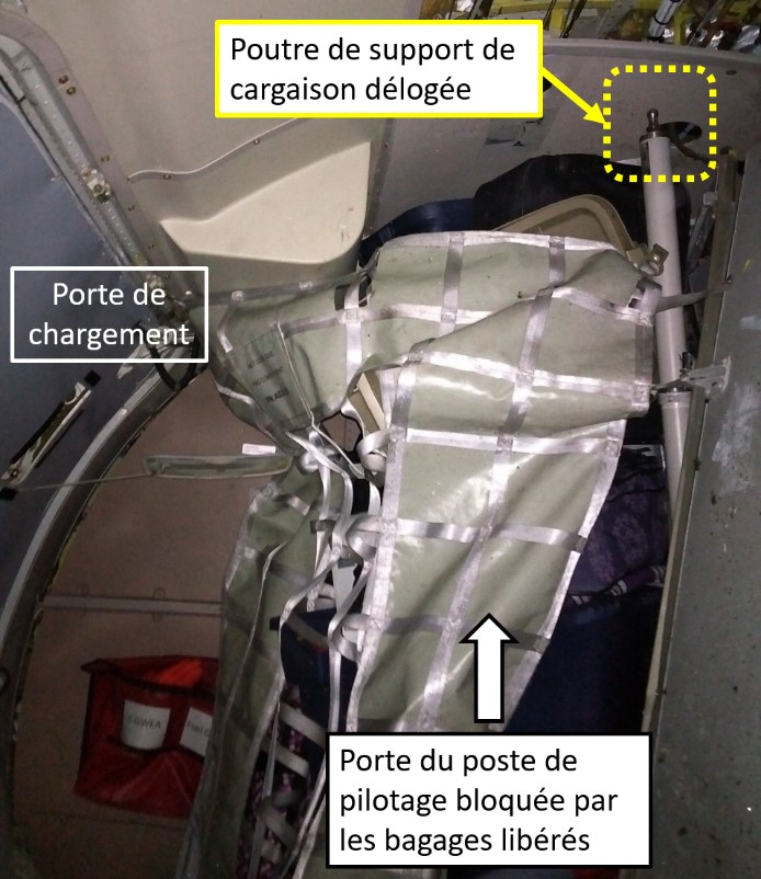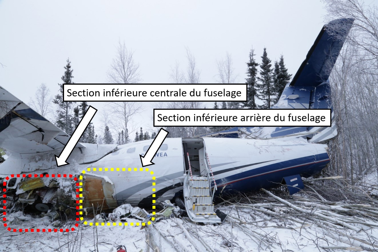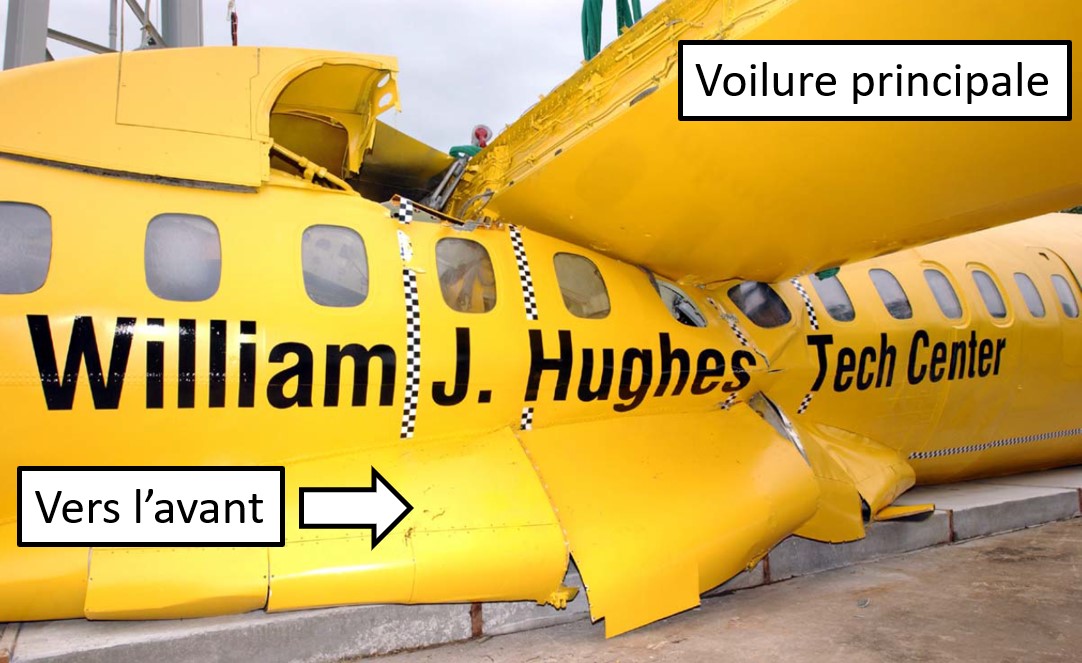 Le train d’atterrissage principal, sous la section centrale du fuselage, était rigide et n’a pas absorbé ou atténué une grande partie de la charge. L’accélération produite par l’impact n’a pas été atténuée parce que le logement du train d’atterrissage ne s’est pas déformé. Cette accélération non atténuée s’est traduite par une importante charge inertielle de la voilure, qui a provoqué la rupture de la structure de soutien de la voilure et l’affaissement de la voilure dans la cabine.