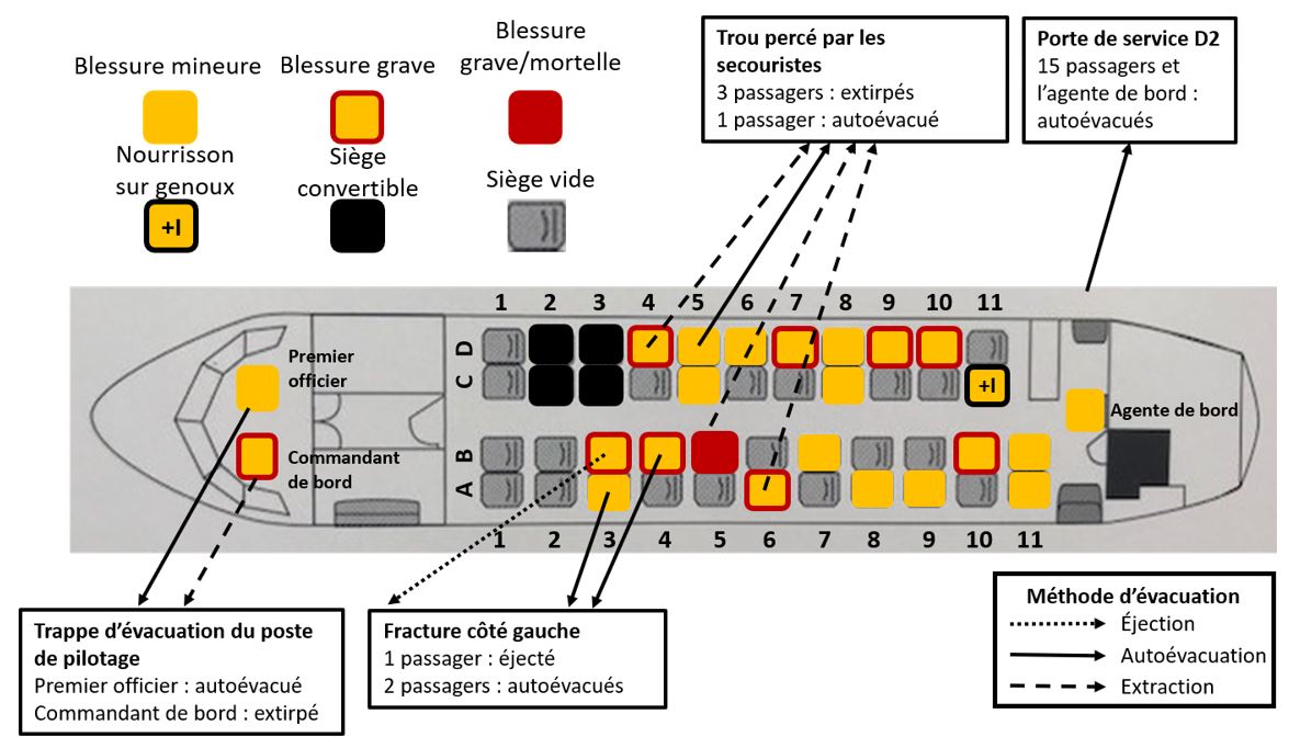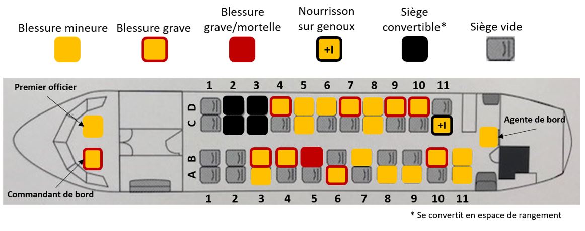 La réduction de l’espace de survie entre le plancher au-dessus du train d’atterrissage principal et le fuselage supérieur affaissé a causé des blessures par écrasement, comme des traumas à la tête, au corps et aux jambes, aux passagers de la partie avant-centre gauche de l’aéronef. Sur les 3 passagers de cette zone, 2 ont subi des blessures graves qui ont changé leur vie, et 1 passager est mort.