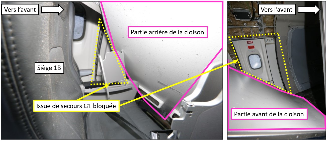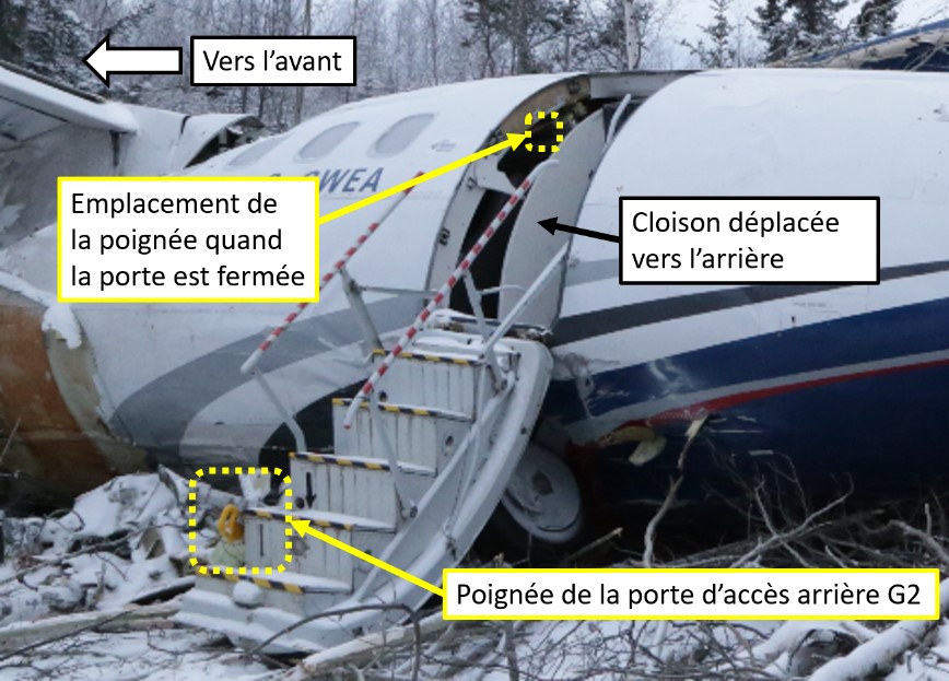 Une fois les passagers à bord de l’aéronef, le premier officier a fait le tour de l’aéronef à pied pour effectuer une inspection visuelle de l’extérieur. Bien que cette inspection ait été effectuée de nuit sur une aire de trafic faiblement éclairée, sans lampe de poche, le premier officier a pu constater de la contamination sur le nez de l’aéronef et un peu de glace résiduelle sur les bords d’attaque des ailes, les entrées d’air des moteurs et le stabilisateur vertical. Le premier officier a terminé l’inspection externe en effectuant l’examen visuel de l’aile gauche du haut de la porte à escalier incorporé sur le côté gauche à l’arrière de la cabine.