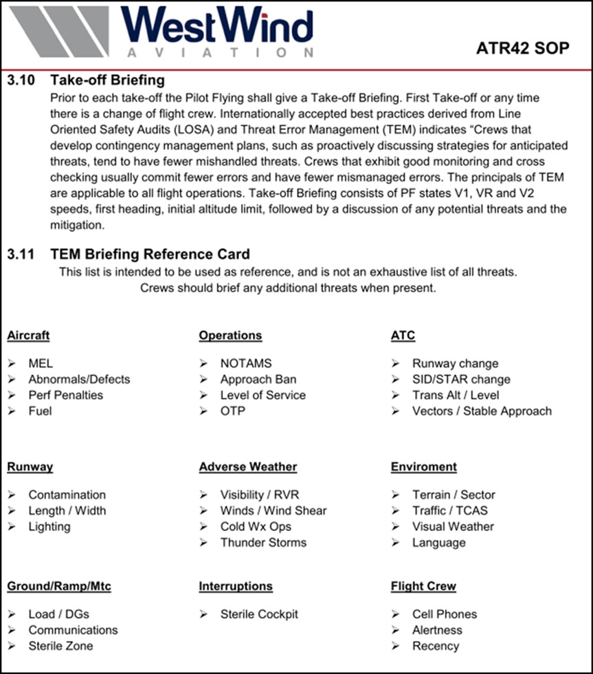 Dans le cadre des vérifications pendant la circulation, à 18 h 07 min 45 s, le commandant de bord a mené l’exposé de décollage. Au cours de cet exposé, le commandant de bord a parlé de la menace potentielle connue que constituait un départ vers une zone de noirceur, et la façon dont elle pourrait être contrée.