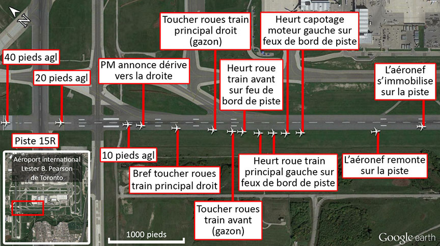 À 0 h 02 min 07 s, les roues du train d'atterrissage principal gauche ont touché le revêtement de la piste, suivi rapidement d'un très bref toucher, ou bond, des roues du train d'atterrissage principal droit. À ce stade, l'aéronef se trouvait sur le revêtement asphalté de la piste, à 2227 pieds du seuil décalé et à 64 pieds à droite de l'axe de piste. La roue extérieure du train d'atterrissage principal droit était à environ 20 pieds du bord de piste droit. L'aéronef a continué de dériver vers la droite après le bond, et lorsque les roues du train d'atterrissage principal droit ont de nouveau touché le revêtement, elles étaient environ 8 pieds à droite du revêtement asphalté, dans le gazon mouillé.