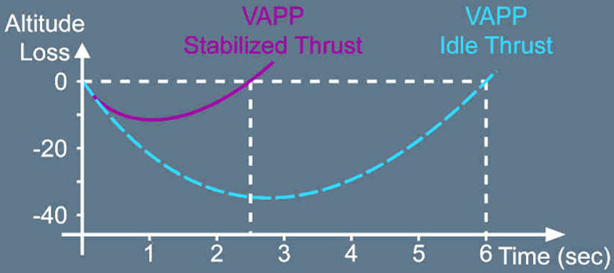 La perte d'altitude est d'environ 10 pieds lorsque la poussée est stabilisée, mais peut atteindre 40 pieds si la poussée est au ralenti (figure 2). Comme le montre la figure, si la remise des gaz survient à la vitesse d'approche et lorsque la poussée est au ralenti, l'aéronef pourrait mettre jusqu'à 3 secondes pour établir une vitesse ascensionnelle positive, et jusqu'à 6 secondes pour rejoindre l'altitude à laquelle la remise des gaz a été amorcéeNote de bas de page 7.