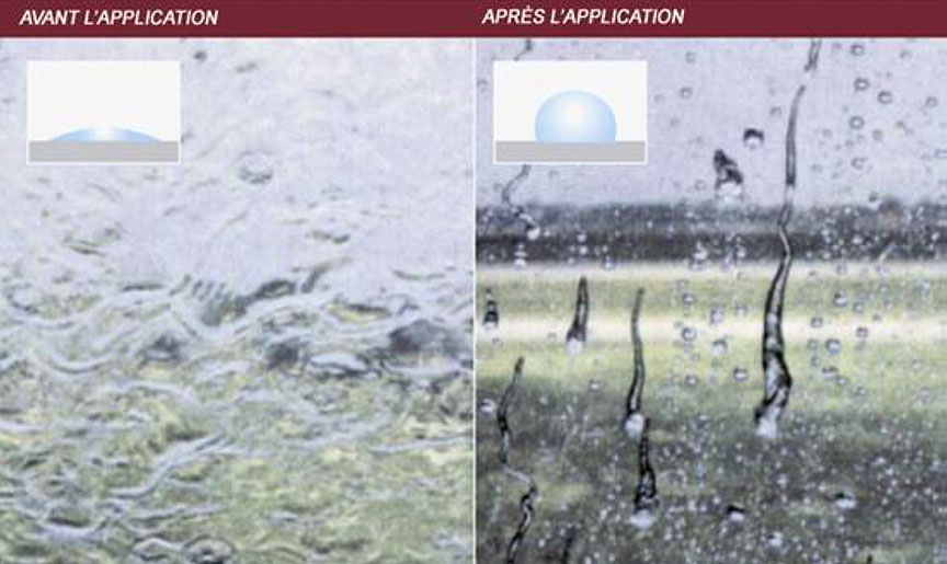 Le chasse-pluie agit rapidement et longtemps sans laisser de résidu et sans créer de distorsion, et il rétablit la visibilité en l'espace de quelques secondes. La tension superficielle du pare-brise, qui est modifiée temporairement, jumelée à l'écoulement de l'air, empêche l'adhérence des gouttes d'eau au pare-brise (figure 3).