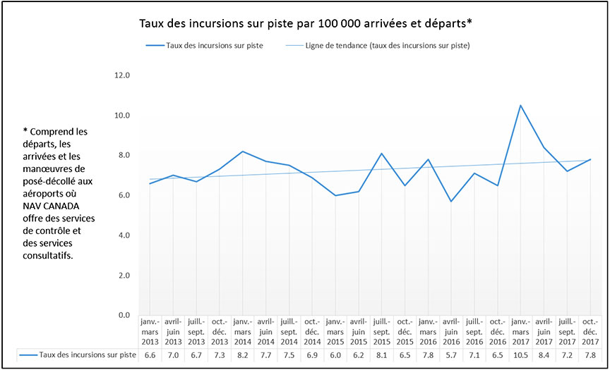 De 2013 à 2017, NAV CANADA a enregistré en moyenne 445 incursions sur piste par année (figure 1). Durant cette période, le taux d'incursions par mouvement d'aéronef a graduellement augmenté de 6,6 à 7,8 incursions par 100 000 arrivées et départs.