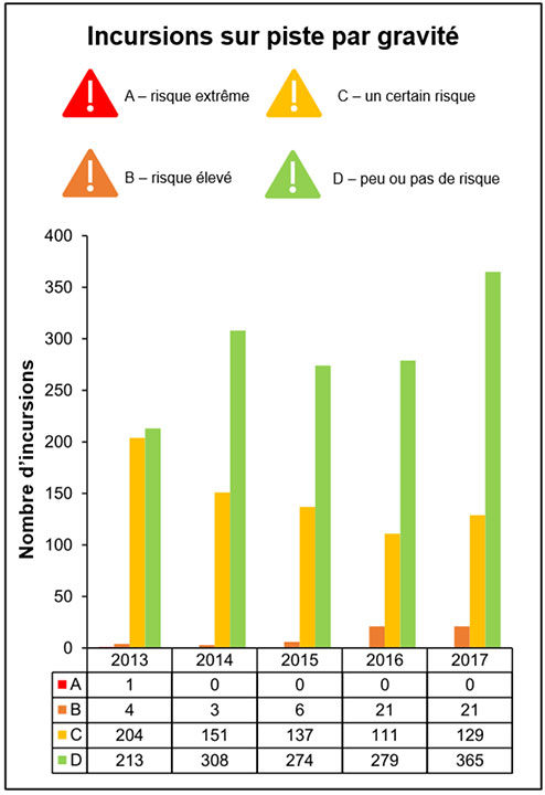 Si la majorité de ces incursions pose peu ou pas de risque, on a dénombré 21 événements très graves (catégorie B) au cours de chacune des 2 dernières années (figure 2). Ces événements auraient pu entraîner une collision avec un aéronef, des dommages, des blessures et des pertes de vie.