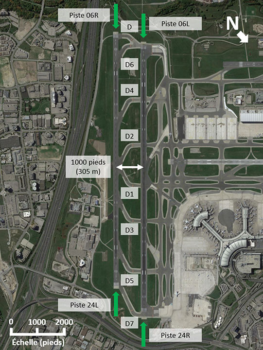 Plusieurs caractéristiques de configuration des voies de circulation entre les pistes d'atterrissage sont inhabituelles comparativement à celles d'autres aérodromes en Amérique du Nord et ailleurs dans le monde. L'écart entre ces pistes (305 m [1000 pieds]) est relativement faible, et les voies de sortie rapide (RET) permettent d'accéder directement à la piste adjacente, sans passer par une autre surface de transition. Les points d'attente avant piste sont aménagés immédiatement après une courbe à 65° et sont plus éloignés de la piste intérieure protégée que dans d'autres aéroports.