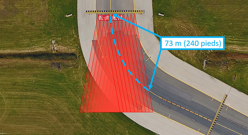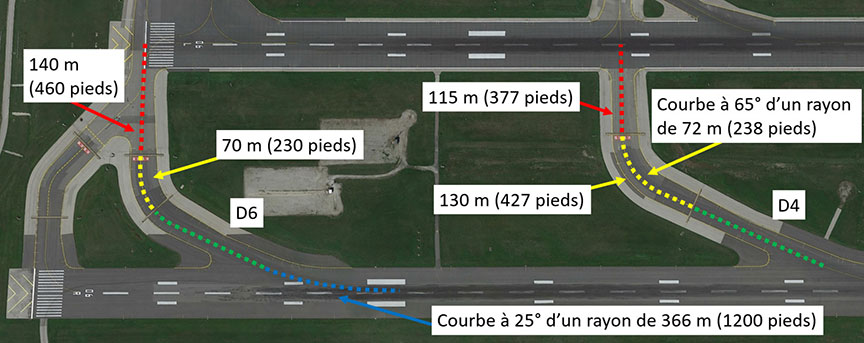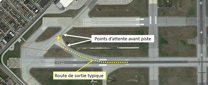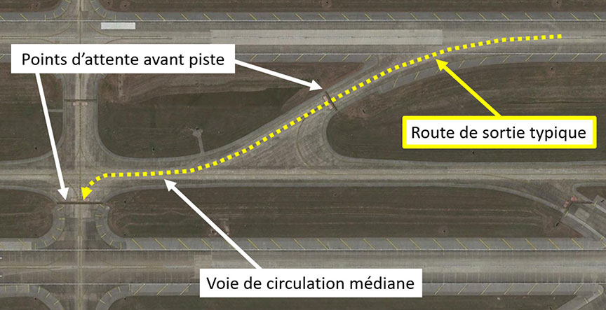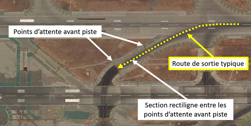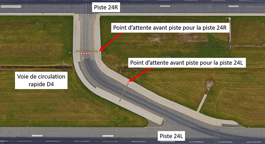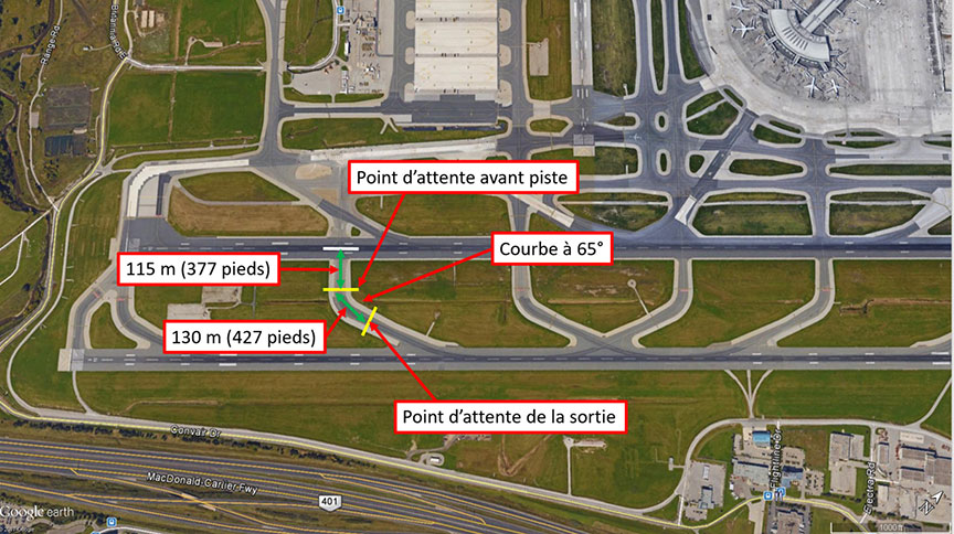 L'aménagement des voies de sortie rapide a été retenu comme facteur contributif aux incursions sur la piste 06L/24R. Ces voies de sortie rapide comprennent une section rectiligne à un angle oblique par rapport aux 2 pistes, suivi d'une courbe qui place l'aéronef perpendiculaire à la piste. Ainsi, un aéronef qui dégage la piste sud n'est pas aligné avec les balises lumineuses et marques d'attente à l'écart tant qu'il n'a pas négocié cette courbe; l'aéronef se trouve alors très près de la barre d'arrêt. Les équipages de conduite qui n'anticipent pas l'emplacement de la ligne d'arrêt n'auront peut-être pas le temps d'immobiliser leur aéronef à partir du moment où ils les apercevront.