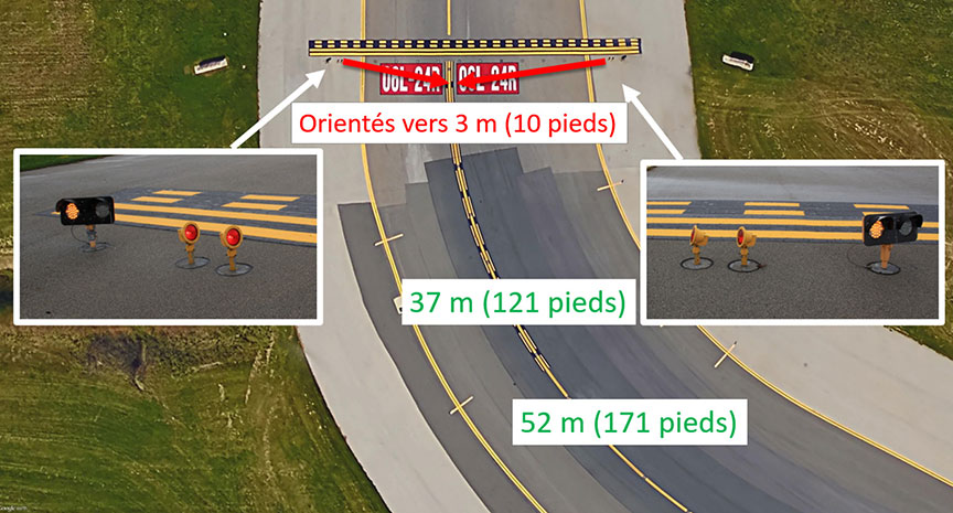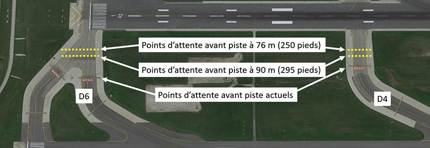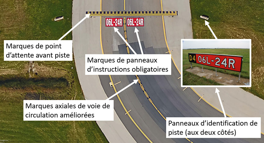 - L'amélioration des marques de point d'attente avant piste se prolongeant jusque dans les accotements de voie de circulation;
