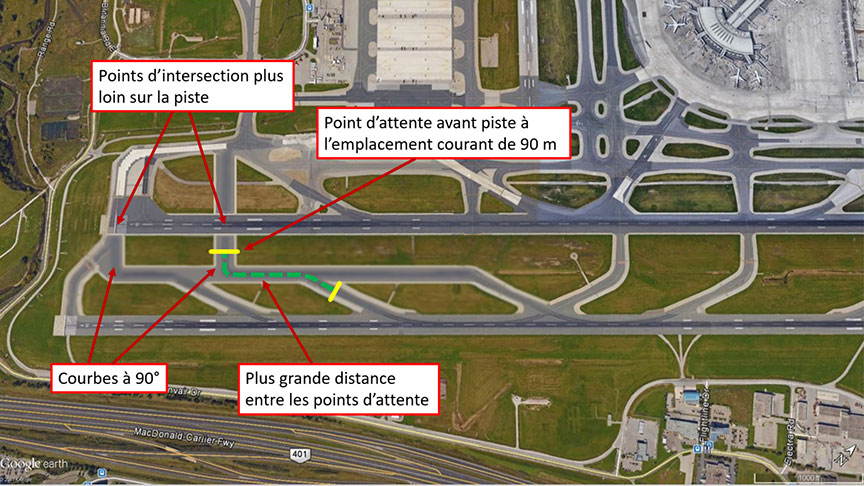 Toutes les stratégies applicables que recommandent les lignes directrices internationales ont été mises en œuvre au complexe sud, sauf une : modifier l'aménagement des voies de circulation. Un changement de cette ampleur pourrait être nécessaire pour : accroître la distance et le temps de roulage entre les points d'attente avant piste; réduire les vitesses de roulage des aéronefs qui approchent des points d'attente à l'écart; et prévenir l'accès direct aux pistes adjacentes depuis les RET. Les modifications possibles aux aménagements qui pourraient corriger ces facteurs comprennent l'insertion entre les pistes d'une voie de circulation leur étant parallèle, comme on en trouve dans plusieurs aérodromes aux pistes parallèles, et le déplacement des aides visuelles à des endroits standards.