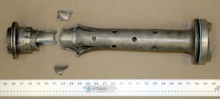 L'inspection à CYUL a révélé que l'aéronef avait subi des dommages considérables, notamment une déformation du revêtement sous les hublots du côté droit du fuselage (figure 1). Les conditions subies par le train d'atterrissage principal droit lors du deuxième poser des roues dépassaient ses critères de rupture, ce qui avait causé un bris du tube-support d'orifice pendant la compression (figure 2). Après le bris du tube-support d'orifice, l'amortisseur ne pouvait plus jouer son rôle, de sorte que les charges au point de compression maximal étaient considérables.