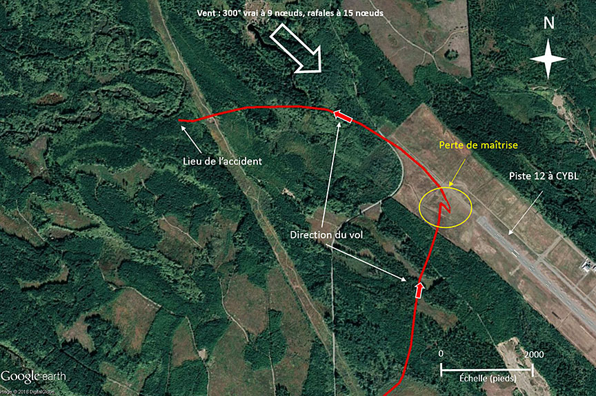 À 15 h 53, durant le segment d'approche finale à CYBL, le pilote qui occupait le siège de droite a cédé la commande de l'hélicoptère à la pilote du siège de gauche pour la démonstration d'une manœuvre. Peu après le transfert des commandes, alors que l'hélicoptère survolait de près le relief à basse vitesse, il a amorcé une rotation intempestive vers la droite. Après plusieurs révolutions, l'hélicoptère a volé en direction nord-ouest en s'éloignant de l'aéroport. Durant cette période, il a atteint une altitude de quelque 150 pieds au-dessus du niveau du sol (AGL) et une vitesse sol de quelque 85 nœuds.