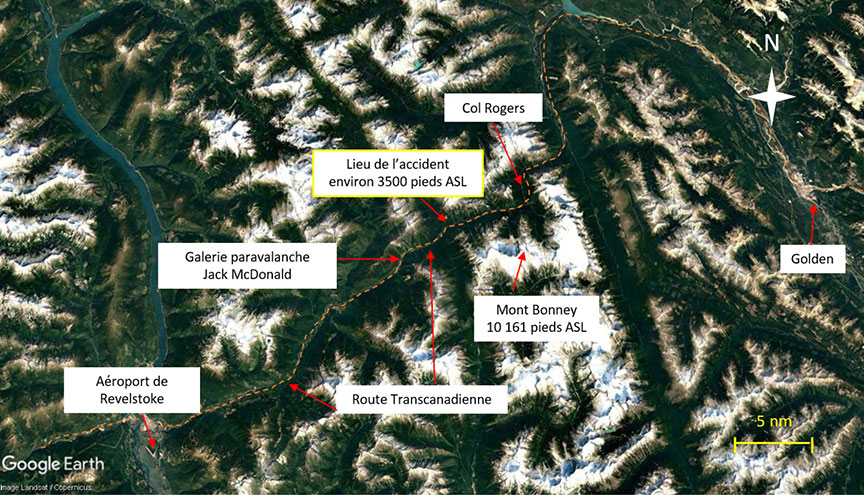 Le 10 septembre 2018, un hélicoptère qui se dirigeait vers l'aéroport de Kamloops (CYKA) (Colombie-Britannique) a trouvé le lieu de l'accident à environ 26 milles marins (nm) au nord-est de CYRV (figure 2). L'épave se trouvait dans le parc national des Glaciers, dans un secteur densément boisé situé à environ 500 pieds au nord de la route Transcanadienne et à quelque 3500 pieds ASL.