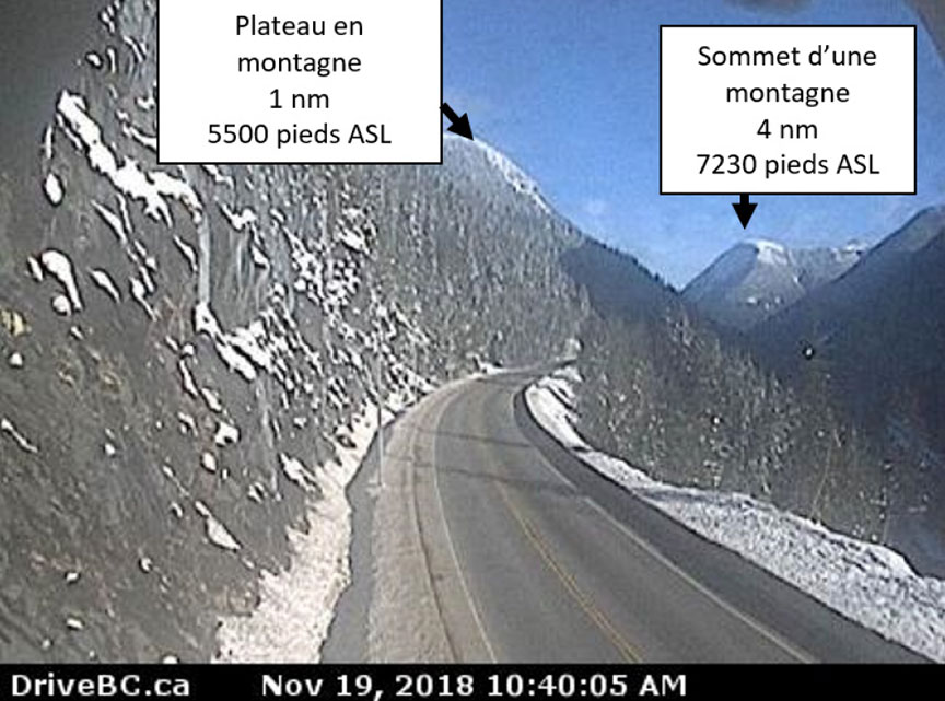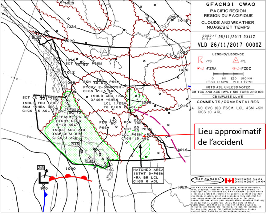 D'après la prévision de zone graphique (GFA) (figure 3), les prévisions pour le secteur est de la Colombie-Britannique (dans les montagnes Rocheuses et le long de la route vers CZVL) étaient les suivantes : nuages épars à partir de 6000 pieds ASL et sommets à 8000 pieds ASL; couche de nuages épars à partir de 10 000 pieds ASL et sommets à 22 000 pieds ASL; visibilité supérieure à 6 sm. De plus, on prévoyait des plafonds localisés à 1500 pieds AGL et de la faible pluie. Dans un secteur près du parc national des Glaciers et du col Rogers, on prévoyait des plafonds intermittents à 800 pieds AGL avec de la brume et de la faible pluie, et la visibilité devait varier de 5 sm à plus de 6 sm. Le coucher du soleil à Revelstoke, le 25 novembre 2017, était à 15 h 54.