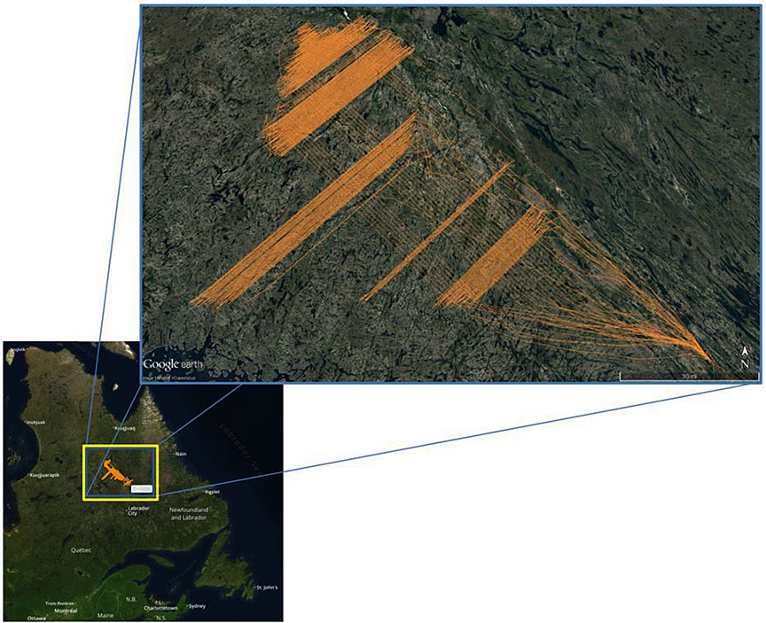 Ce travail de relevés magnétométriques était effectué à basse altitude (300 pieds au-dessus du sol [AGL]) au-dessus d'une zone préalablement déterminée selon un profil de vol préétabli par le client. Chaque aéronef avait à son bord 2 pilotes qui se partageaient par alternance le rôle de pilote aux commandes durant les segments de vol généralement répartis sur 2 blocs de vol journaliers pouvant durer jusqu'à 5 heures chacun. Un bloc de vol typique comprenait un décollage à partir de l'aéroport de Schefferville, considéré comme la base d'exploitation, un segment de vol vers la zone de travail, de multiples segments de vol parallèles à une altitude de 300 pieds AGL dans la zone de travail, et un segment de vol de retour suivi de l'atterrissage à la base (figure 1).