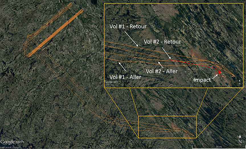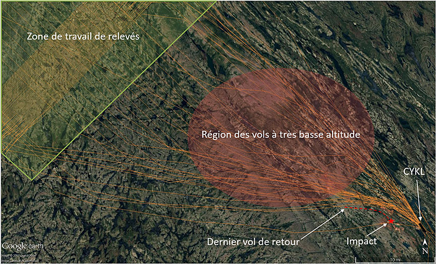 Comme les vols de relevés magnétométriques sont effectués à basse altitude, l'équipage avait effectué un survol de repérage de la zone de travail afin d'identifier les dangers potentiels; toutefois, les segments d'aller et de retour n'avaient pas à faire l'objet d'un tel survol et l'enquête a démontré que le site de l'accident n'avait pas été survolé (figure 8).