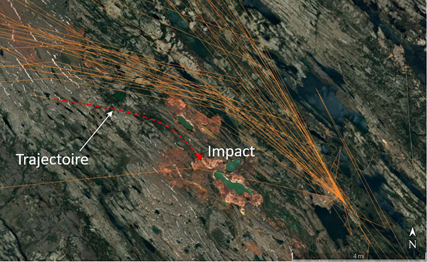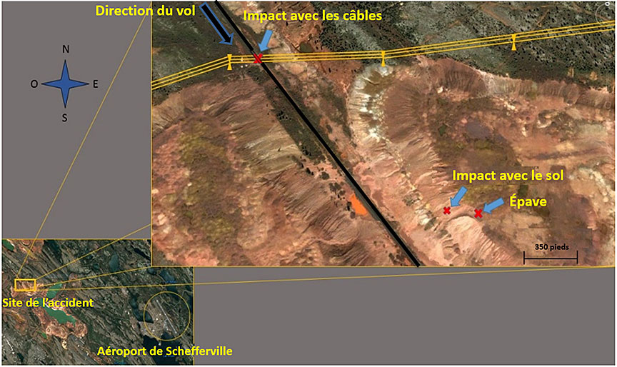 À la suite de la collision avec les câbles, l'aéronef a continué son vol en déviant vers la gauche avant de percuter le sol tout près du sommet de la pente ascendante du dépôt minier du côté est, approximativement 1400 pieds au sud-est du point d'impact avec la ligne de transport d'électricité.