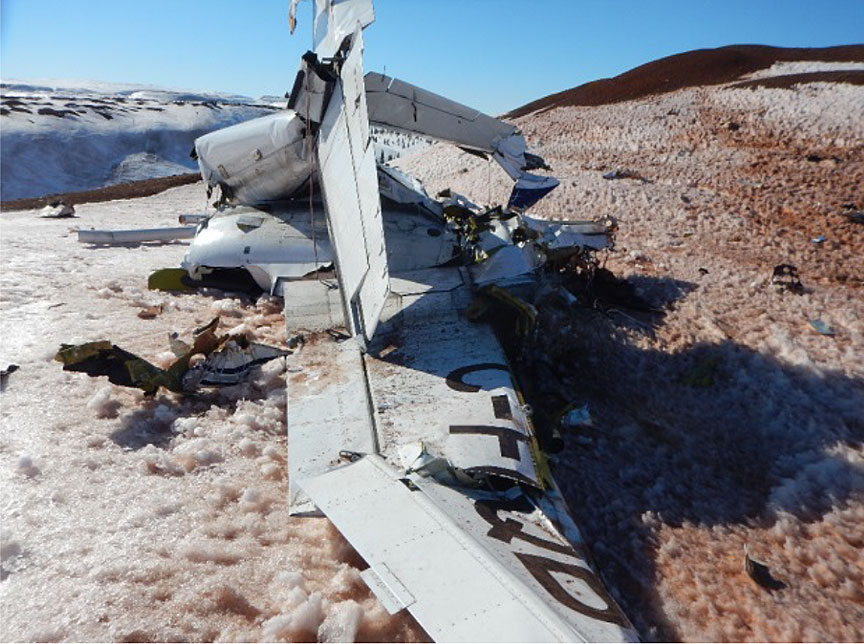 L'épave de l'aéronef a été retrouvée au sommet du plateau à quelque 134 pieds à l'est du point d'impact initial avec le sol (figure 4). Le moteur gauche, séparé de l'épave (figure 5), ainsi que l'hélice, reposaient un peu plus loin. Des sections de câbles conducteurs étaient enroulées autour de l'arbre d'entraînement de l'hélice du moteur gauche. Toutes les sections principales de l'aéronef étaient présentes. Les volets et le train d'atterrissage étaient en position rentrés. Les manettes des gaz étaient à la position de puissance maximale.