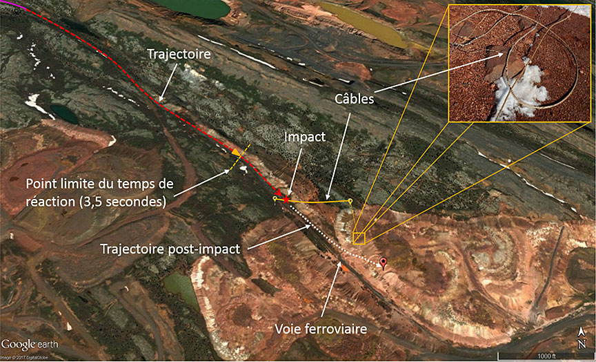 Au moment où l'aéronef approchait de cette limite, le pilote devait effectuer un virage à droite afin de demeurer au-dessus de la voie ferroviaire, ce qui n'était pas propice à un balayage visuel à une plus grande distance pour déceler des câbles. Pendant ce virage, l'aéronef a franchi le point limite (figure 9) à partir duquel il ne restait plus suffisamment de temps de réaction pour éviter les câbles.