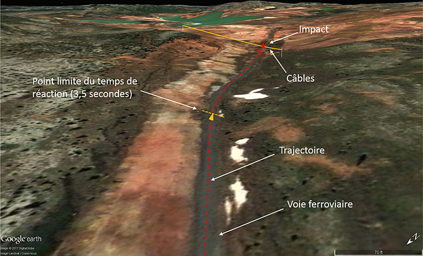 Selon les données du système mondial de localisation (GPS), l'aéronef survolait la voie ferroviaire à une vitesse sol de 169 nœuds, soit 286 pieds par seconde. Cette vitesse multipliée par le temps de réaction estimé pour éviter les câbles à 3,5 secondes donne un produit d'environ 1000 pieds. Donc, le pilote devrait être en position de voir les câbles 1000 pieds avant ces derniers, sinon il ne serait plus possible de les éviter.