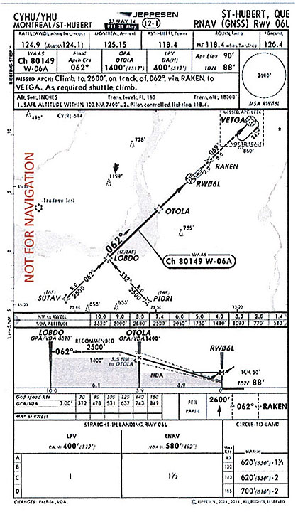 Avant la descente, le PF a effectué un exposé d'approche. Considérant la direction et la vélocité des vents au sol, obtenus plus tôt dans la journée, l'équipage de conduite a convenu de planifier l'approche RNAVNote de bas de page 3 (GNSSNote de bas de page 4) Rwy 06L (annexe A). Au cours de l'exposé, il a été convenu de poursuivre la descente durant l'approche jusqu'à 400 pieds ASL, soit l'altitude de décisionNote de bas de page 5 publiée avec l'utilisation de la procédure performance d'alignement de piste avec guidage vertical (LPV).