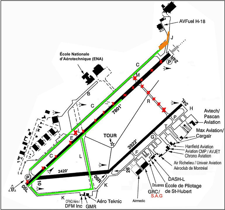 - L'aéronef en cause dans l'événement, dont l'envergure d'ailes était supérieure à 78 pieds, devait soumettre à Développement Aéroport Saint-Hubert de Longueuil un préavis de 48 heures. Rien n'indique qu'un tel préavis a été soumis par la compagnie ou l'équipage de conduite. Un tel avis aurait résulté en l'obtention d'un croquis de la piste 06L/24R qui aurait pu permettre à l'équipage de conduite d'avoir une représentation visuelle des travaux en cours et des aires de mouvement fermées.