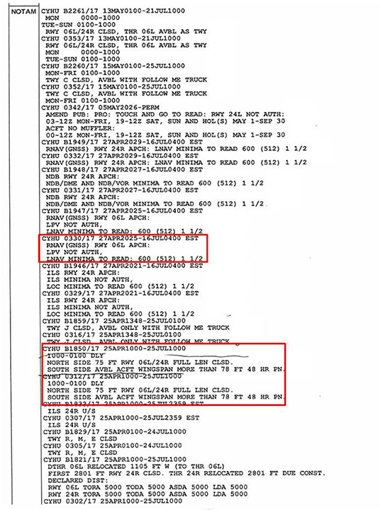 De la liste des 37 NOTAM concernant CYHU, 8 portaient sur des travaux de construction aéroportuaire, et le NOTAM relatif à la réduction de la largeur de la piste était le 16e de la liste. Le même NOTAM indiquait que, pour les aéronefs dont l'envergure était de plus de 78 pieds, il fallait donner un préavis de 48 heures aux autorités aéroportuaires. Puisque le N888ZJ a une envergure de plus de 78 pieds, ce NOTAM s'appliquait. Or, tel qu'indiqué à la section 1.10.3 du présent rapport, rien n'indique qu'un tel avis ait été donné aux autorités aéroportuaires de CYHU. L'information recueillie indique que l'équipage de conduite croyait à tort que seulement la longueur de piste avait été réduite et non la largeur.