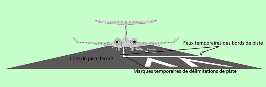 - Avant l'atterrissage, l'équipage a mal interprété le marquage de la piste et le pilote aux commandes a perçu la marque latérale de piste temporaire servant à délimiter le côté gauche de la piste comme étant l'axe de piste. Par conséquent, l'aéronef s'est posé en partie à l'extérieur des limites de la piste prévue et a fauché 7 feux temporaires de bord de piste.