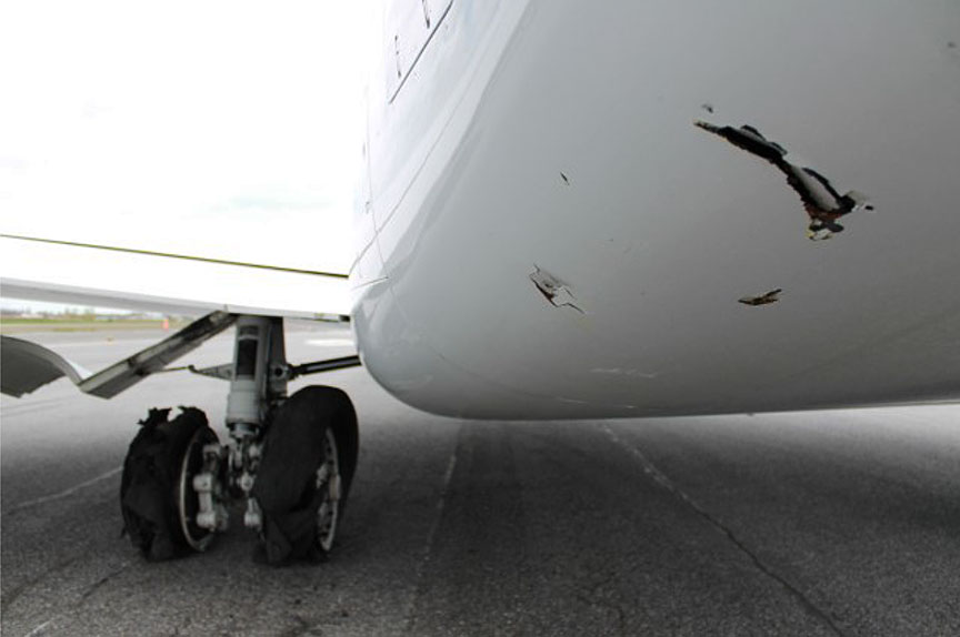 - au fuselage central arrière, qui a été perforé par les débris des feux temporaires de bord de piste (figure 2).
