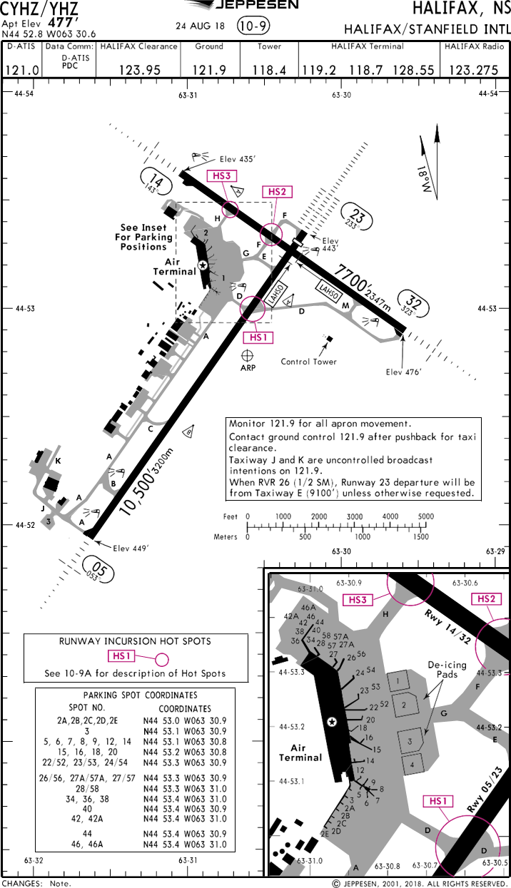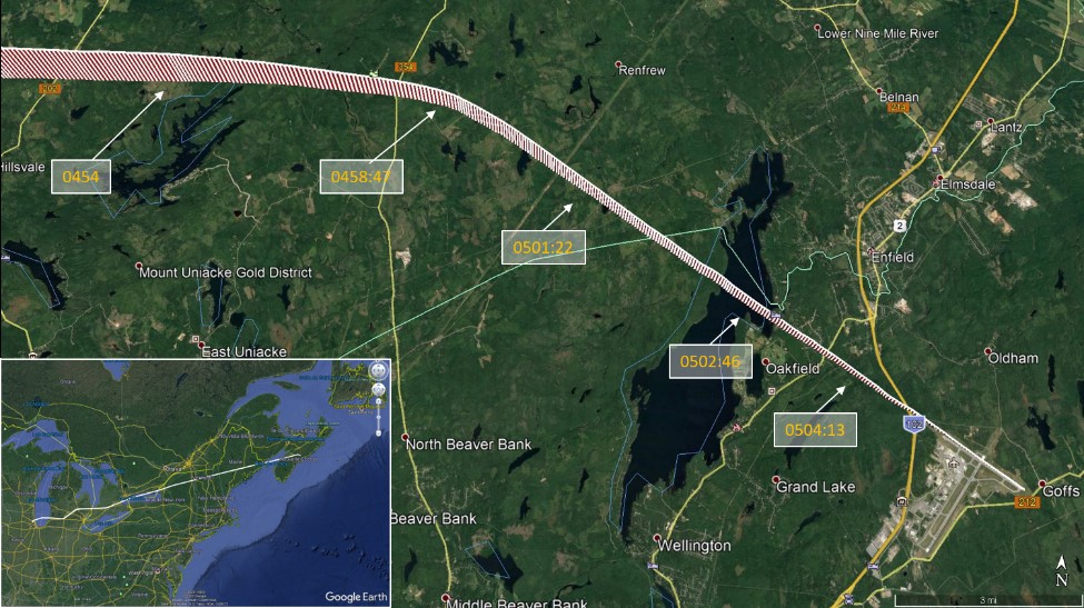 À 4 h 54, le contrôleur tour à CYHZ a informé le contrôleur du centre de contrôle régional (ACC) de Moncton que la piste d’arrivée passait de la piste 14 à la piste 23 en raison d’un changement de direction des vents, et que l’approche vers l’aéroport était maintenant une approche en navigation de surface (RNAV) vers la piste 23. Au moment de cet échange de renseignements, l’aéronef à l’étude franchissait 13 000 pieds ASL en descente et se trouvait à quelque 52 NM de l’aéroport (figure 1). Les renseignements sur le changement de piste n’ont pas été communiqués à l’équipage.