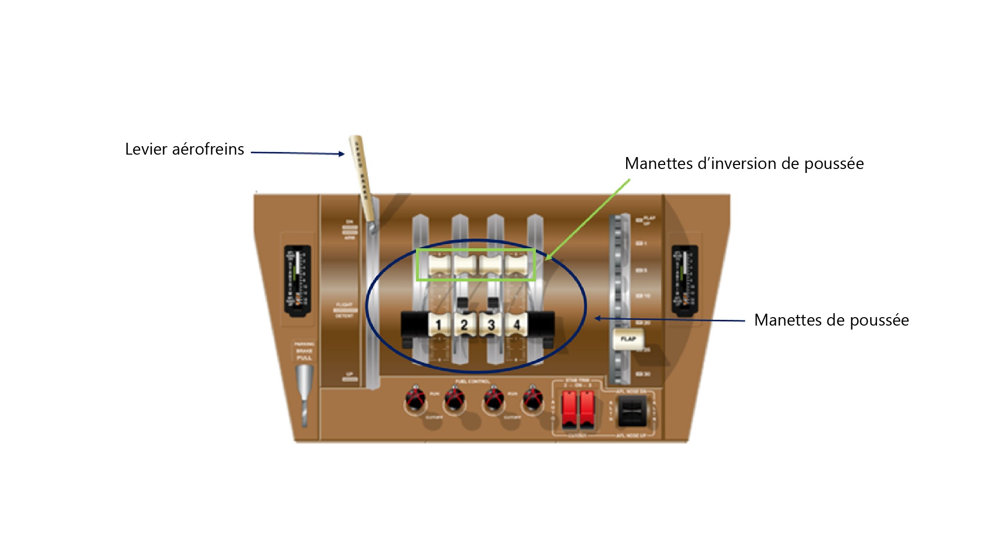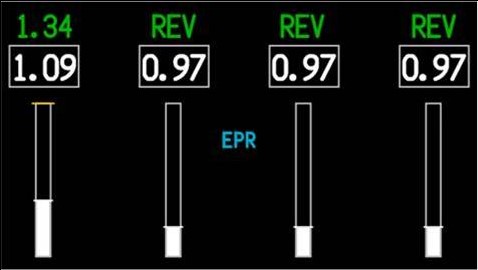 Le levier aérofreins automatique a été placé en position UP [relever], et les panneaux déporteurs ont commencé à se déployer jusqu’à 30 %. La manette de poussée no 1 a été déplacée au-delà du niveau de ralenti; toutefois, cette action n’a pas été remarquée par l’équipage. Le déplacement de la manette de poussée a entraîné le retour des aérofreins en position DOWN [abaisser] et la rentrée des panneaux déporteurs. Alors que le PF plaçait les manettes de poussée no 2, no 3 et no 4 en position d’inversion de poussée, les commutateurs logiques air-sol du train d’atterrissage sont passés momentanément en mode AIR, ce qui signifie que les roues ne supportaient pas entièrement le poids de l’aéronef, avant de revenir au mode GROUND [sol].