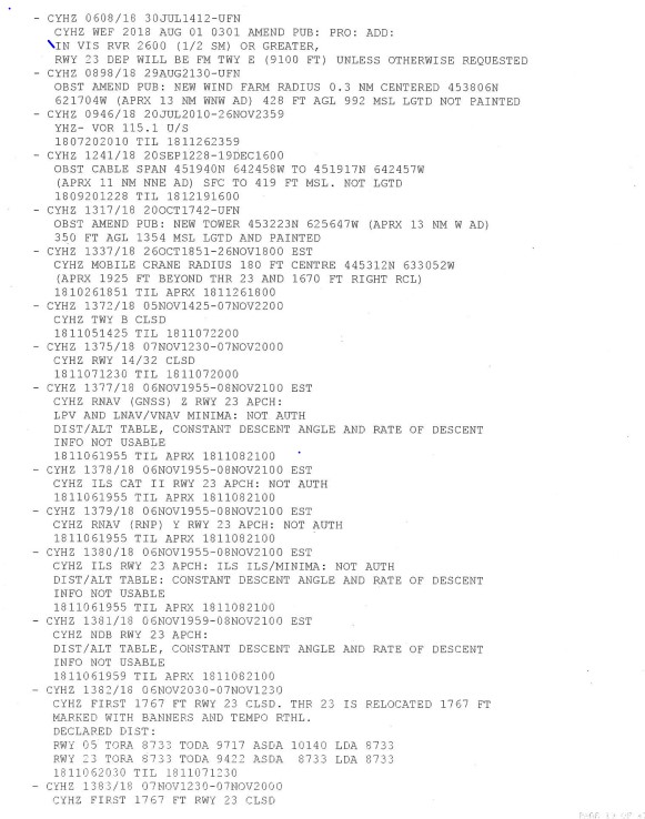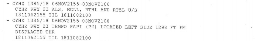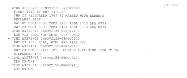 À 5 h 01, le contrôleur de l’ACC de Moncton a ordonné à l’équipage dans l’événement à l’étude de passer à la fréquence de la tour de CYHZ. Au moment du contact initial, le contrôleur tour de CYHZ a informé l’équipage que les vents soufflaient du 260° M à 15 nœuds et a demandé si l’équipage avait le message d’information ATIS Tango. L’équipage a répondu qu’il avait le message d’information Tango, sans pour autant prendre connaissance du fait que la piste 23 était disponible.