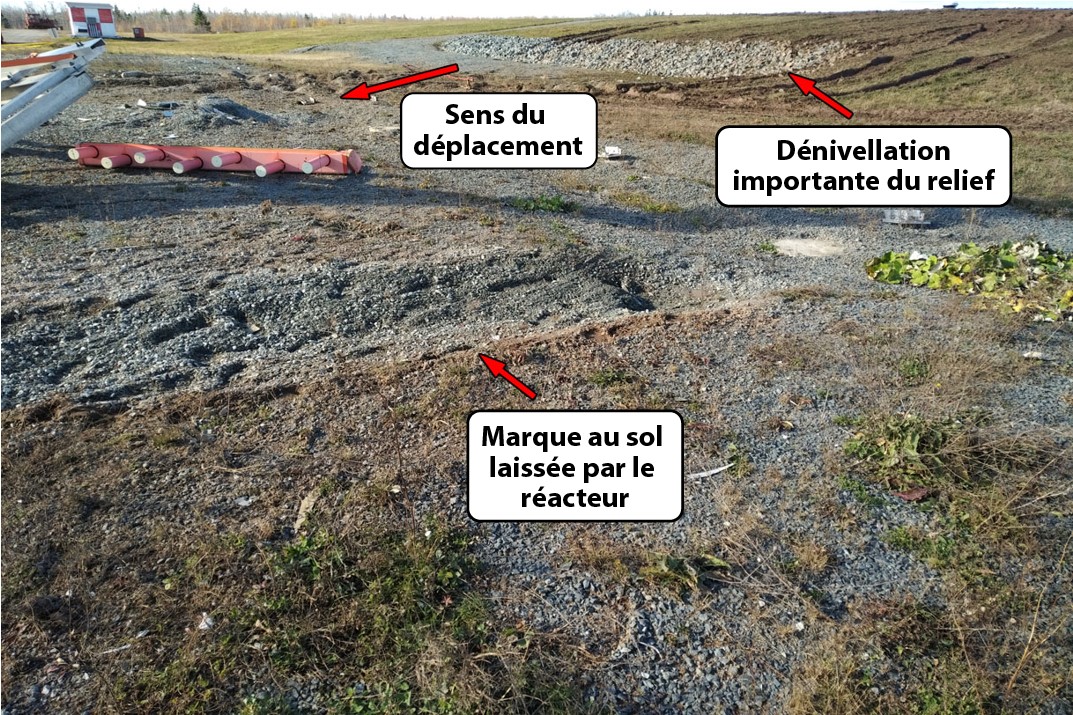 Après que l’aéronef eut quitté la surface revêtue, le train d’atterrissage a laissé des ornières (marques au sol) dans l’herbe (annexe C).