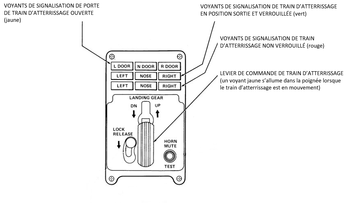 On entre ou sort le train d’atterrissage au moyen du levier de commande du train d’atterrissage. Un voyant de signalisation jaune s’allume dans le levier lorsque le train d’atterrissage est en mouvement (c’est-à-dire que sa position ne correspond pas à celle commandée). Neuf voyants de signalisation dans le haut du tableau de commande indiquent les positions du train d’atterrissage et des portes du train. Un voyant de signalisation jaune de porte ouverte s’allume lorsque la porte qui lui est associée est ouverte. Un voyant de signalisation vert s’allume lorsque le train d’atterrissage qui lui est associé se trouve en position sortie et verrouillée. Un voyant de signalisation rouge de train d’atterrissage non verrouillé s’allume lorsque le train d’atterrissage qui lui est associé ne se trouve ni en position sortie et verrouillée, ni en position rentrée et verrouillée.