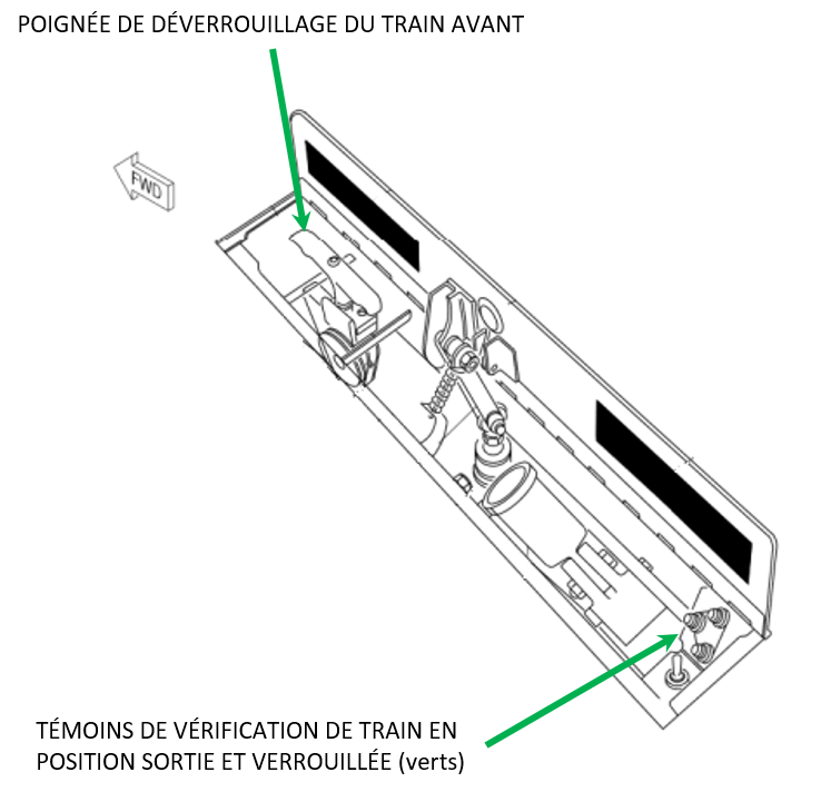 Il faut ensuite ouvrir la trappe du système de secours de sortie du train d’atterrissage qui se trouve au plancher du poste de pilotage, révélant ainsi une pompe à main qui peut être utilisée pour faire sortir complètement le train d’atterrissage principal, au besoin. La poignée de déverrouillage du train avant (figure 3) se trouve à côté de cette pompe. Tirer sur cette poignée déverrouille les portes avant du train avant en premier lieu, puis déverrouille le train avant de sa position rentrée, qui sort complètement grâce à la gravité et à l’écoulement d’air en vol. Un système secondaire de vérification de la position sortie et verrouillée permet de vérifier que le train d’atterrissage qui lui est associé se trouve dans cette position.